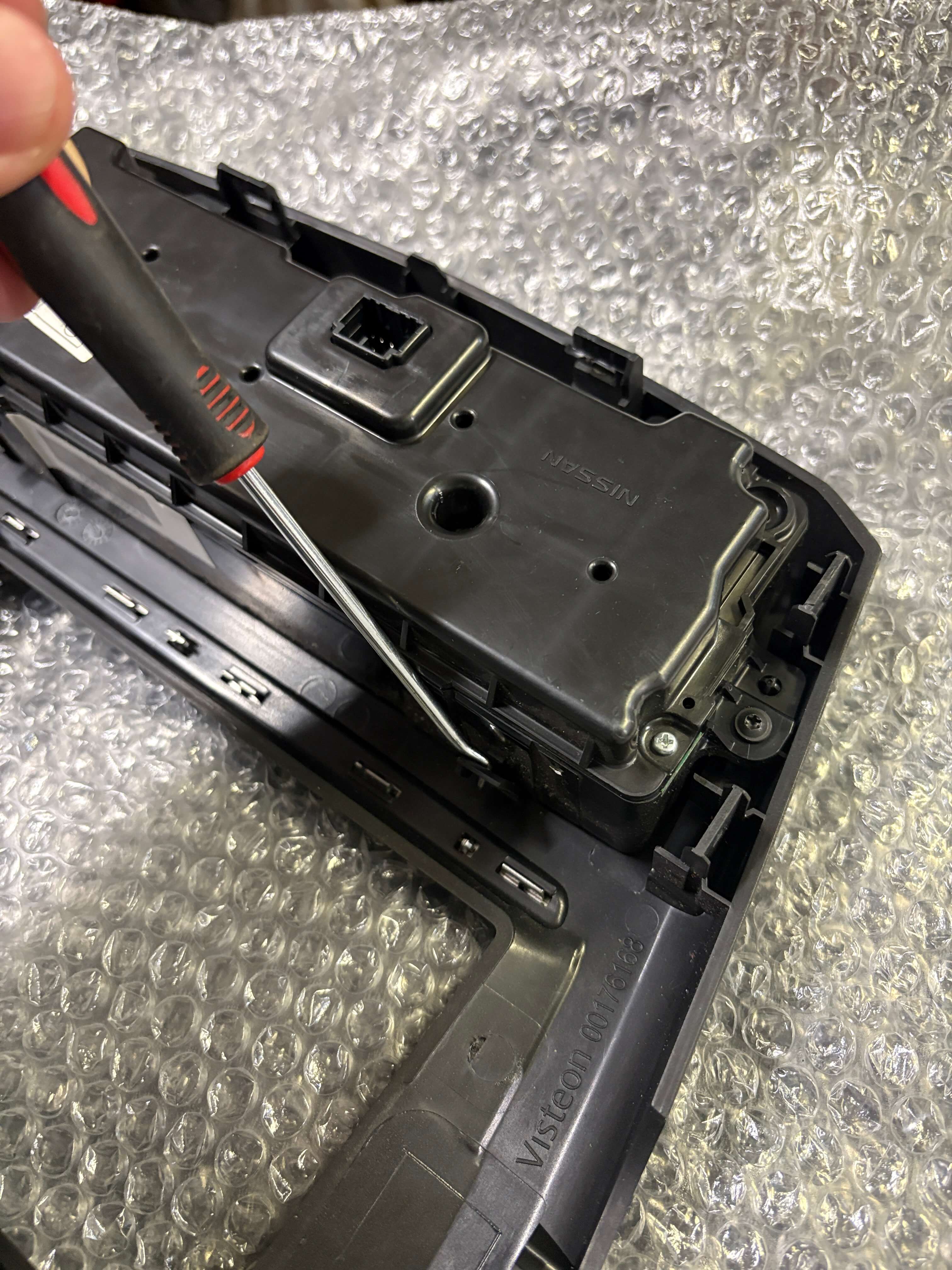 Z rámečku je následně potřeba demontovat panel klimatizace. Ten je v něm opět pouze nacvaknutý. Je tedy nutné opatrně podebrat plastové úchyty a panel klimatizace vytlačit ven. Následně se jednoduše nacvakne do nového rámečku dodaného spolu s autorádiem.